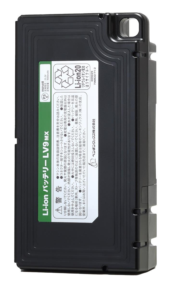9Ah Li-ionバッテリー LV-9MX●ハイコストパフォーマンス9Ahバッテリー●持ちやすさも考えたケースデザイン●高い安全性・小型・軽量(1.8kg)・高出力・国産●メモリー効果がなく、継ぎ足し充電OK■バッテリータイプ : リチウムイオン■バッテリー電圧 : DC25.9v■バッテリー容量 : 9Ah■バッテリー重量 : 1.8kg