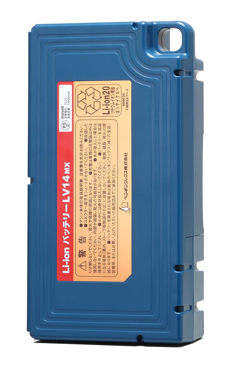 14Ah Li-ionバッテリー LV-14MX●急速充電器対応 大容量14Ahバッテリー●持ちやすさも考えたニューケースデザイン●高い安全性・小型・軽量(2.0kg)・高出力●メモリー効果がなく、継ぎ足し充電OK■バッテリータイプ : リチウムイオン■バッテリー電圧 : DC25.2v■バッテリー容量 : 14Ah■バッテリー重量 : 2.0kg