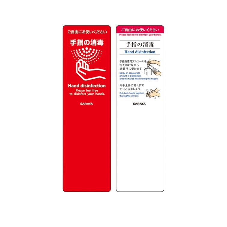 手指消毒を促すパネル付きのボトルスタンド。