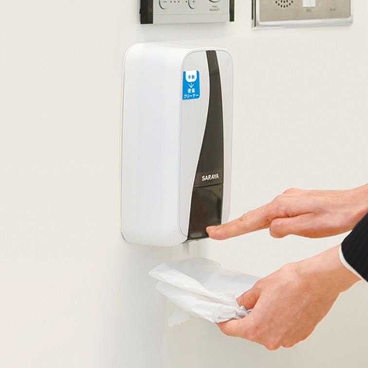 ワンプッシュで泡状石けん液、石けん液、または消毒液を吐出・噴射します。 便座クリーナー用にも使えます。カギ付き。用途がわかる「ピクトラベル」付き。