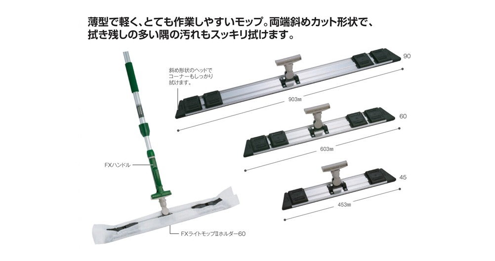 薄型で軽く、とても作業しやすいモップ。両端斜めカット形状で、拭き残しの多い隅の汚れもスッキリ拭けます。